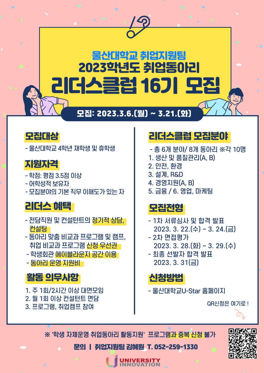1. 동아리명: 리더스클럽 16기 2. 주요 지원내용 - 전담직원 및 컨설턴트의 정기적 상담, 컨설팅 - 동아리 맞춤 비교과 프로그램 및 캠프, 취업 비교과 프로그램 신청 우선권 - 학습공간, 동아리 운영지원비(회의비, 도서비, 소모품비 등) 3. 모집기간: 2023. 3. 6.(월) ~ 3. 21.(화) 4. 운영기간: 2023. 4. 4.(화) ~ 2024. 1. 26(금) 5. 신청대상: 4학년 재학생 및 휴학생 6. 신청방법: 비교과홈페이지(U-STAR) 신청