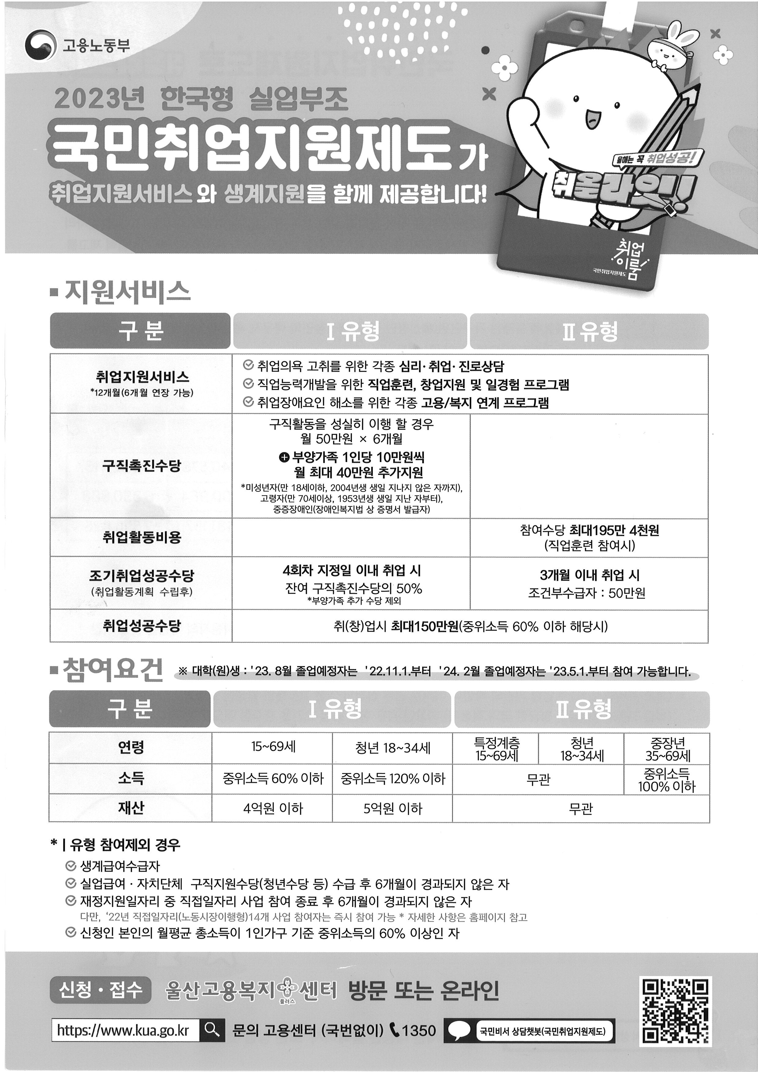 고용노동부에서 시행하는 취업지원제도 홍보 부스가 금주 금요일(5/19)까지 아산도서관 본관과 신관 사이에서 운영된다고 합니다. 취업지원제도는 근로능력과 구직의사가 있음에도 취업하지 못한 청년을 대상으로 직업훈련 등을 진행하고 관련 수당을 지급하는 제도입니다. 우리 학과 12학번 심민정 졸업생이 현재 고용노동부 공무원으로 재직 중인데, 직접 모교에 와서 홍보활동을 하고 있습니다. 홍보 부스에 가서 정보도 얻고 선배와 취업 관련 대화도 하기 바랍니다. |
